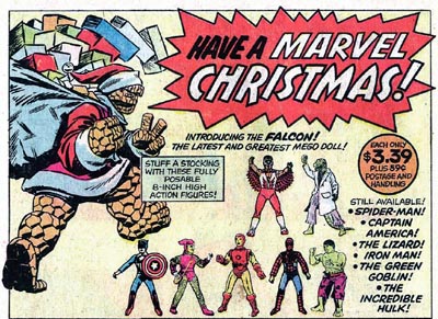 Ad for Marvel Mego dolls (not quite yet "action figures"), artist unknown. Printed in Captain America #193 (January 1976)