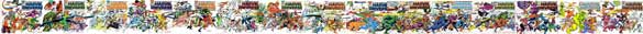 I still don't know what they're running to, but there's a good deal of fun to be found examining these characters closely. Trivia question: the members of which team appear in the line-up twice? (Highlight blank text for the answers!) A: The five original X-Men appear individually and also as a group—X-Factor—on issue #15. Whose uniform was outdated even before the issue they appeared on was published? A: Cyclops, who wears an early design version of his new costume both on the cover and inside issue #2. Marvel admitted their mistake in a later issue. There's one character who appears on the wrong issue's cover. Putting him in the correct position would move him as far away in the alphabet as possible, but physically he'd only move a few feet back. Who is he? A: Arnim Zola, who's alphabetized under "A" rather than "Z." He's on the back of issue #1, but move him a few feet back behind the Abomination and he's in his correct place on the front of issue #15. Who appears on the most different issues? Mr. Fantastic, whose right leg is on the front of issue #7, his entire body across #8, and his right arm stretching through 9, 10, 11, 12, 13, 14...until at last his hand shows up on #15, yanking away the Wrecker's crowbar. Whose body and head doesn't appear at all? A: Stilt-Man: all you can see are his stilts on issue #12. And, what the heck is the Punisher shooting at? A: Looks like Shanna the She-Devil's rear end to me.