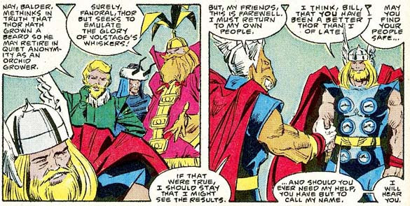 On the usual occasions when he and Frigga would have an argument, Odin would pack his old Troll War army bag and go stomping off to Don Blake's apartment in Manhattan, which required a more subtle hat designed by Jack to appear normal among the humans of Midgard. (He still could keep Pop-Tarts in it, though.) Odin slept on Blake's couch and persuaded Thor to take him at nights to singles bars, but all was well after Jane Foster arranged a blind date for Odin which turned out to be Frigga, and they danced to their favorite love song from their wedding reception and all was well, except for Loki's B-plot of refusing to move his car to the other side of the street for alternate parking. Heh heh heh! That's our Loki!