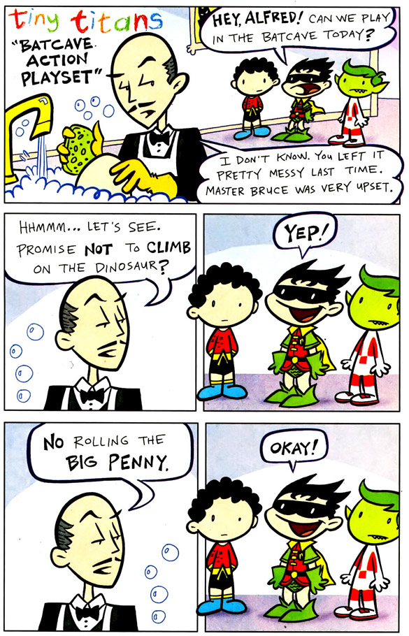 Panels from "Batcave Action Playset" in Tiny Titans #3 (June 2008), script, pencils, inks, colors and letters by Art Baltazar; co-scripted by Franco Aureliani: