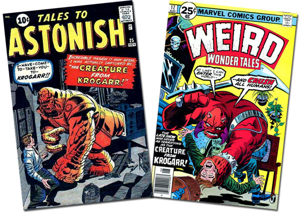 Left: Tales to Astonish #25 (November 1961), pencils by Jack Kirby, inks by Dick Ayers, colors by Stan Goldberg