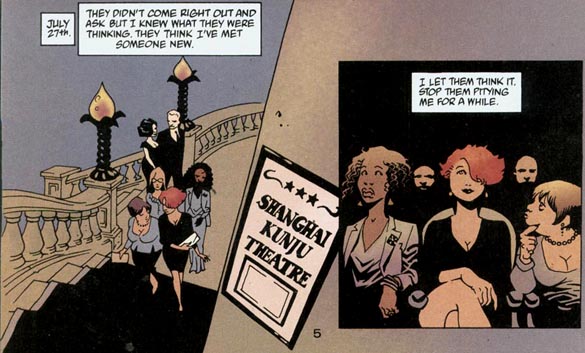 Panel from "The Death of a Romantic" in Heartthrobs #3 (March 1999), script by Peter Milligan, pencils and inks by Eduardo Risso, colors by Grant Goleash, letters by Clem Robins