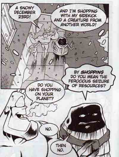 Panels from The Tick's Big Yule Log Special 2000 (one-shot) (2000), script by Clay Griffith and Susan Griffith, pencils by Gabe Crate, ink by Tak Toyoshima