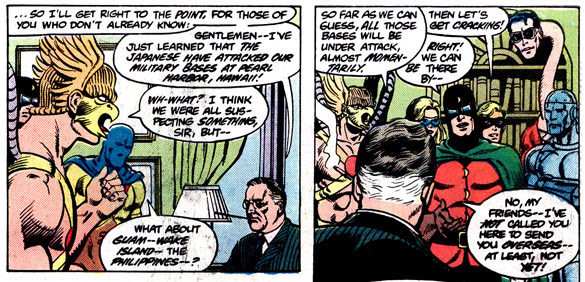 In this post I'm gonna give Roy all the accolades for kicking off his Earth-2/WWII comic series with a solid three-(and a half)-part story that doesn't downplay or trivialize the terror of the Pearl Harbor attack, mostly because the events and evil schemes within are a supervillain's tangent to take advantage of, but not cause, the real-life events.